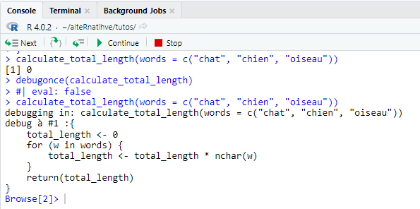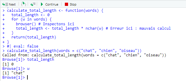 Lorsque vous exécuterez ce code, R entrera en mode interactif. Vous pourrez naviguer dans les étapes de la fonction avec les commandes suivantes :